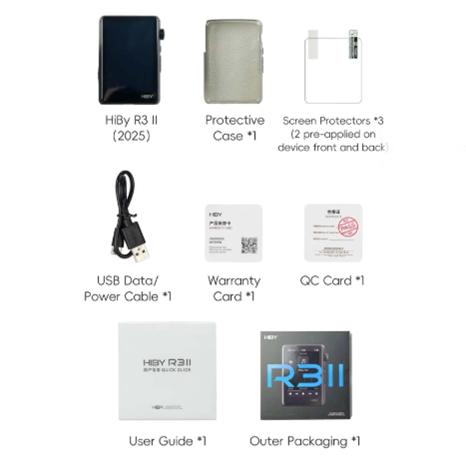 Package Contents | HiBy R3 II 2025 Protective Case * 1 Screen Protectors * 3 (2 pre-applied on device front and back) USB Data/Power Cable * 1 Warranty Card * 1 QC Card * 1 User Guide * 1 Outer Packaging * 1 |