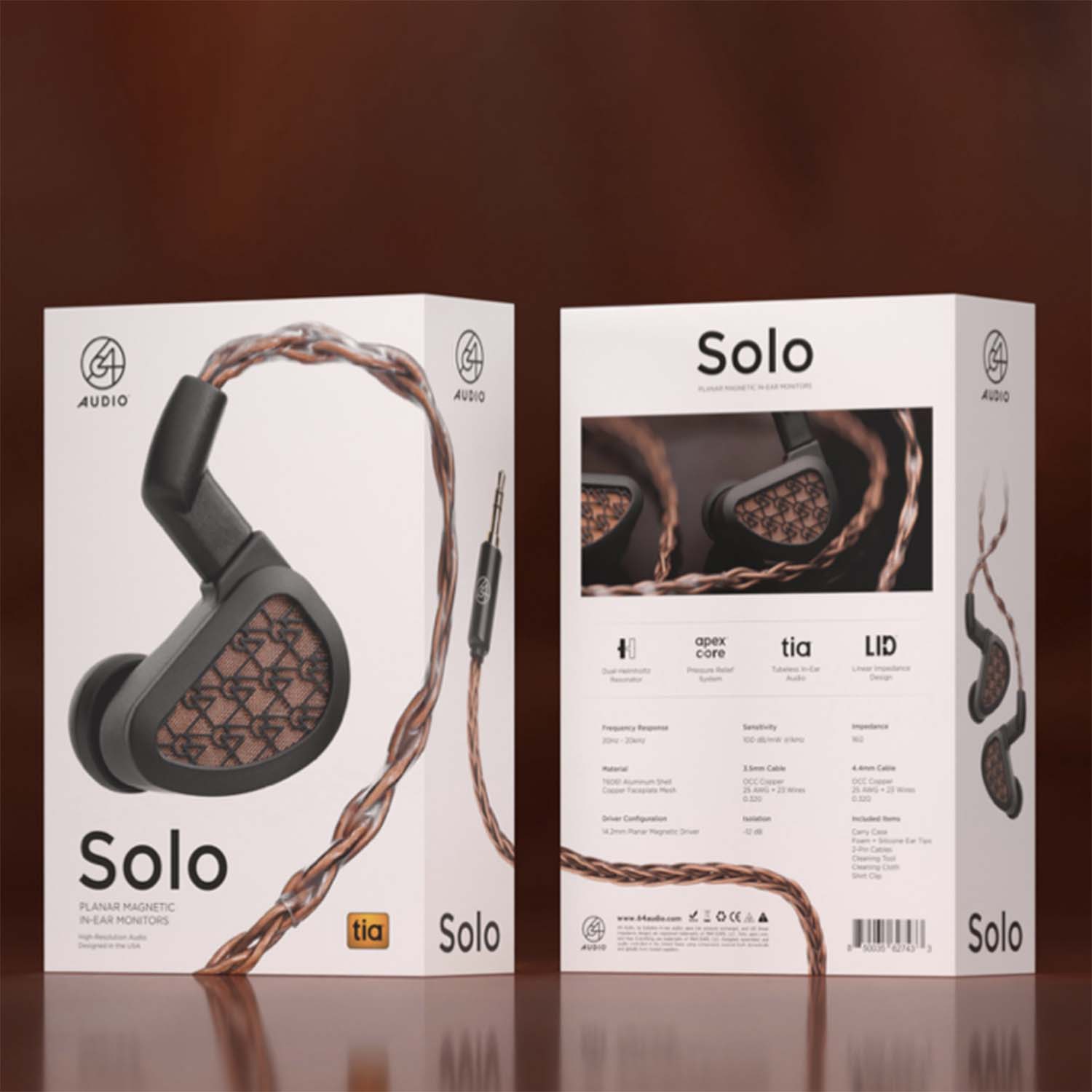 | Package Contents | 64 Audio Solo Carry Case TrueFidelity Foam Ear Tips (S,M,L) SpinFit Silicone Ear Tips (S,M,L) Silicone Ear Tips (S,M,L) 3.5 mm Copper Eight-Braid Cable 4.4 mm Copper Eight-Braid Cable Shirt Clip Cleaning Tool Cleaning Cloth Round Sticker |
