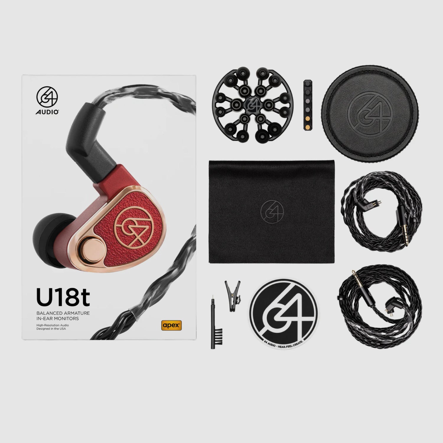 | Package Contents | 64 Audio U18t Universal In-Ear Monitors Carry Case TrueFidelity Foam Ear Tips (S,M,L) SpinFit Silicone Ear Tips (S,M,L) Silicone Ear Tips (S,M,L) 3.5 mm Black Eight-Braid Cable 4.4 mm Black Eight-Braid Cable Shirt Clip Cleaning Tool Cleaning Cloth Round Sticker Apex Modules (m20, m15, m12, mX) |