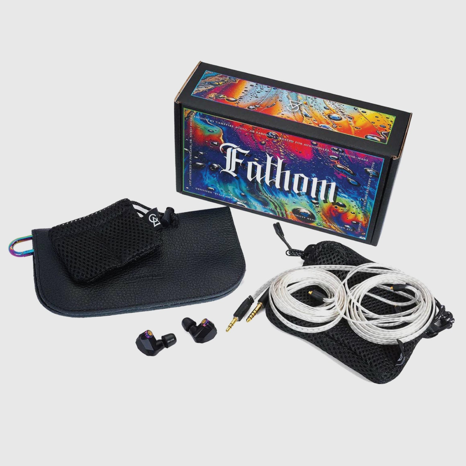 Package Contents | Campfire Audio Fathom Time Stream Cables (3.5mm / 4.4mm Terminations) Select Case Breezy Bag Junior (Small Mesh Zipper Case) Breezy Bag Micro (Two-Pocket IEM Pouch) Earphone Tips (Marshmallow and Silicon) |