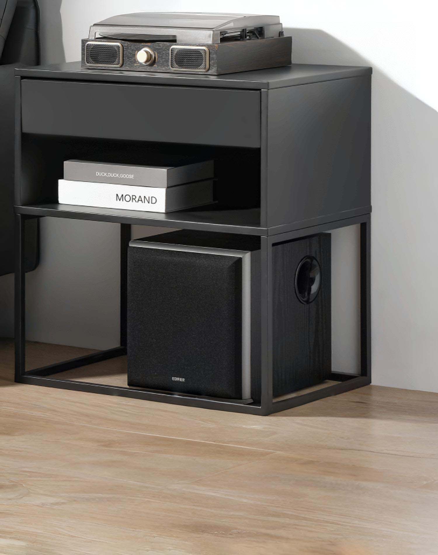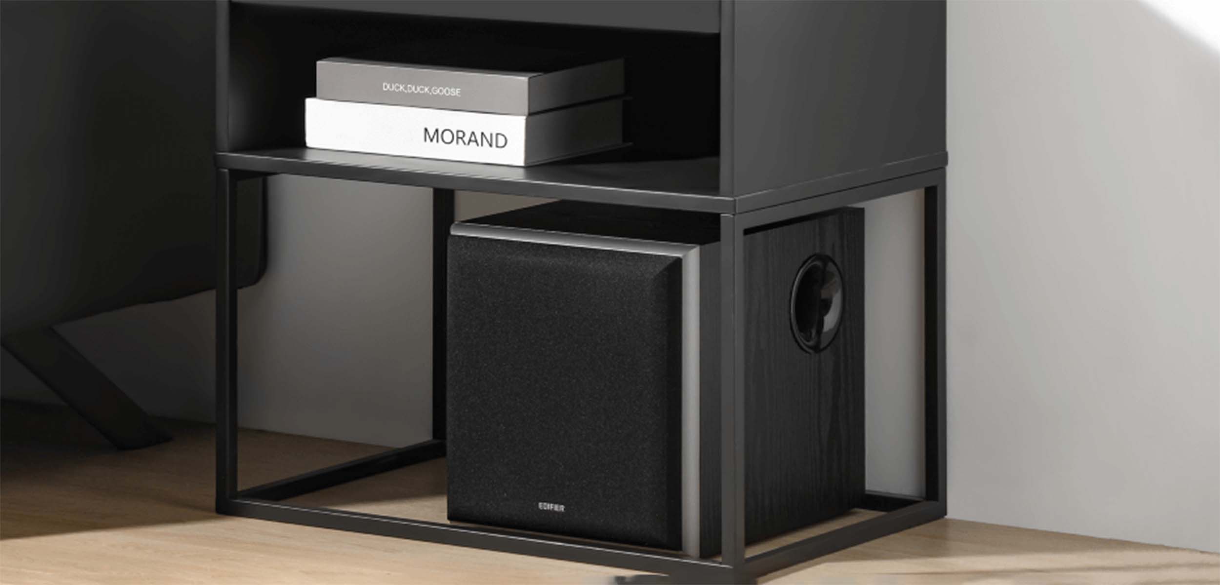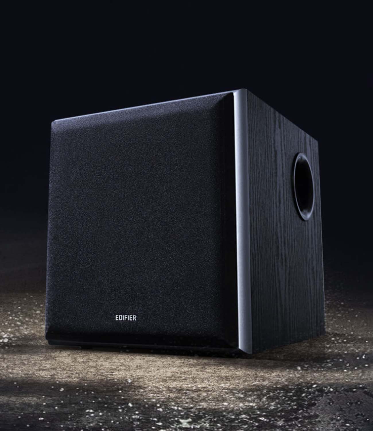 Edifier T5 utilises wood grain vinyl with a low-profile grille for impeccable aesthetics.
