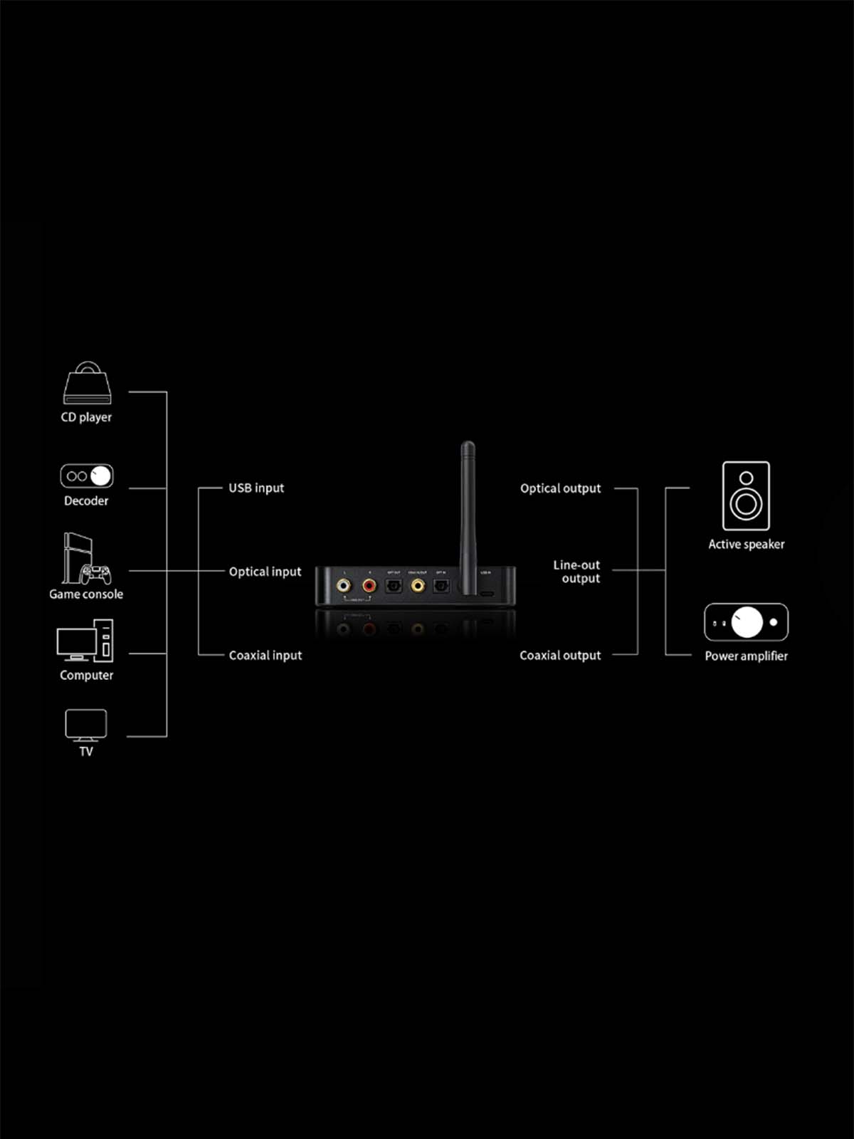 The Digital In & Out's of the BTA30 allows you to connect it to various devices from PC/Laptops,Smartphone's, up to Gaming Consoles or your TV & Stream the audio to your wireless earphones.
