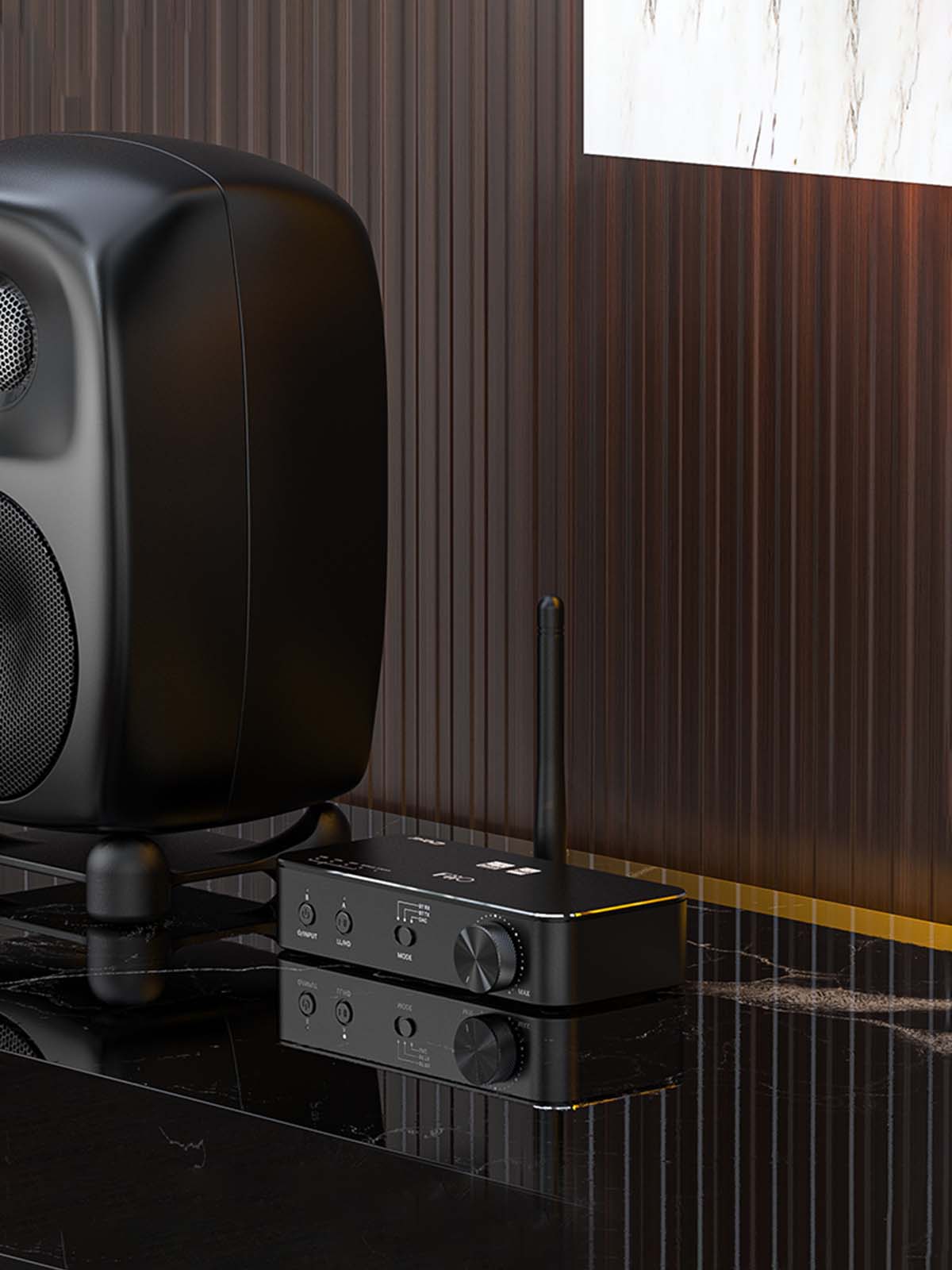 BTA30 is the desktop unit with a one antenna at the & has beautiful glassy finish on top back, dual RCA sockets on the back to connect it as a pre/dac to an amplifier of a stereo system.