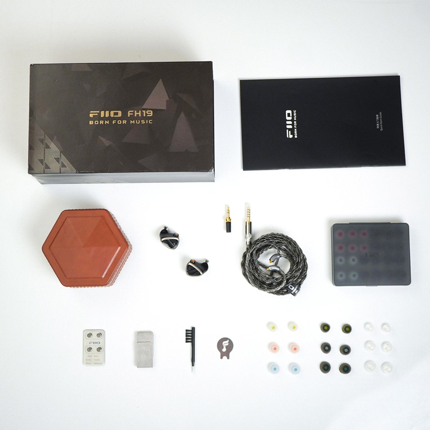 | Package Contents | FiiO FH19 (Demo Unit) FiiO FH19 Packaging*1 HB7 Carrying Case*1 Pure Silver Swappable Plug Earphone Cable*1 3.5/4.4mm Swappable Plugs*1 (4.4mm Pre-Installed) Cleaning Brush*1 Eartips |