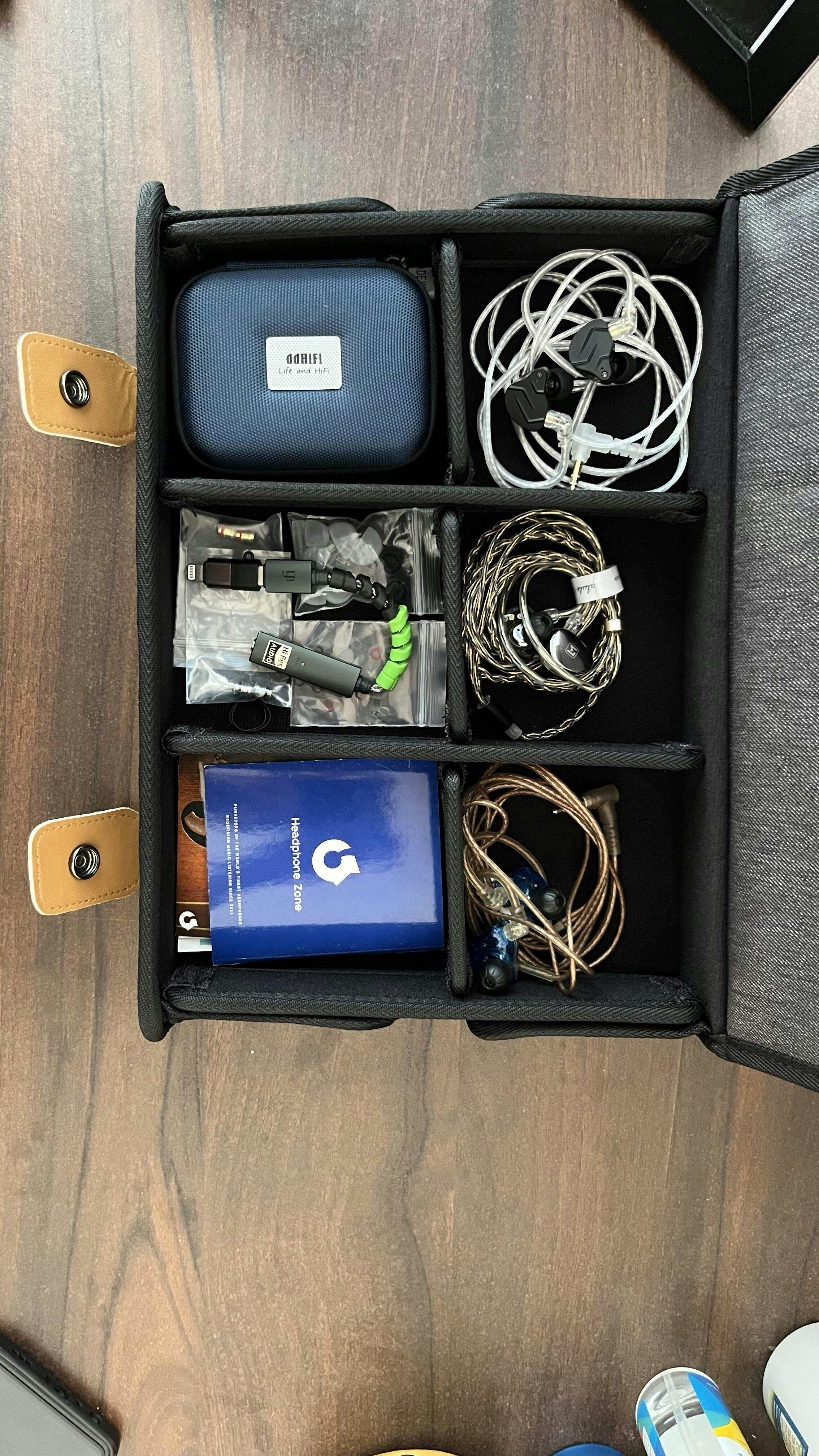This collector's kit is designed to accommodate a wide range of audiophile gear including IEMs, headphones, cables, and accessories, ensuring compatibility with various sizes and types. From compact earbuds to larger over-ear headphones, the adjustable compartment system adapts to different equipment dimensions and collection preferences.