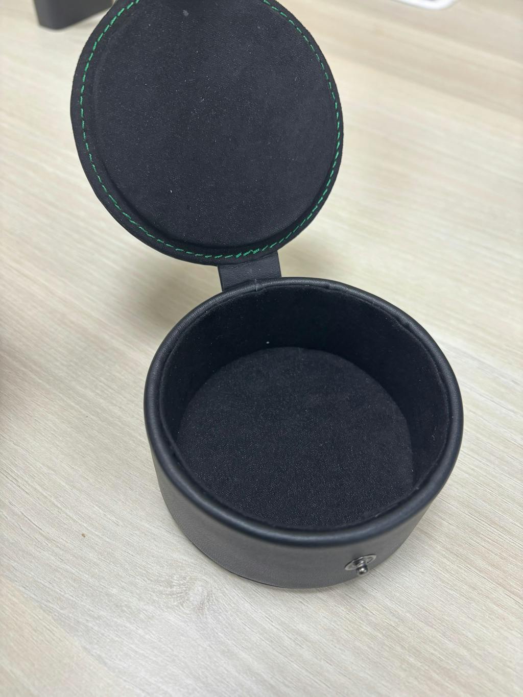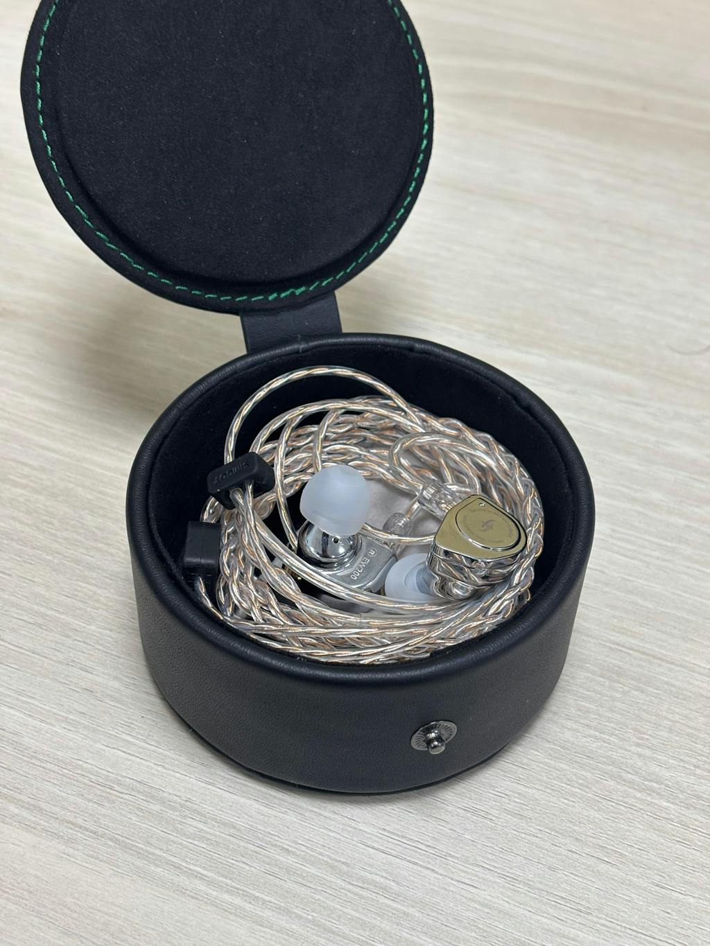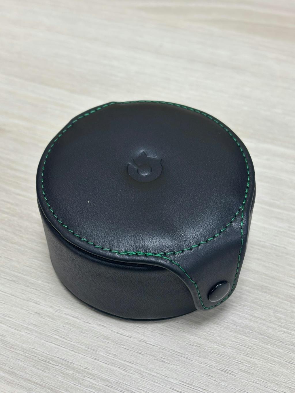 Headphone Zone Wonderwall leather IEM case is detailed with a green stitching against the black leather for an appealing look.