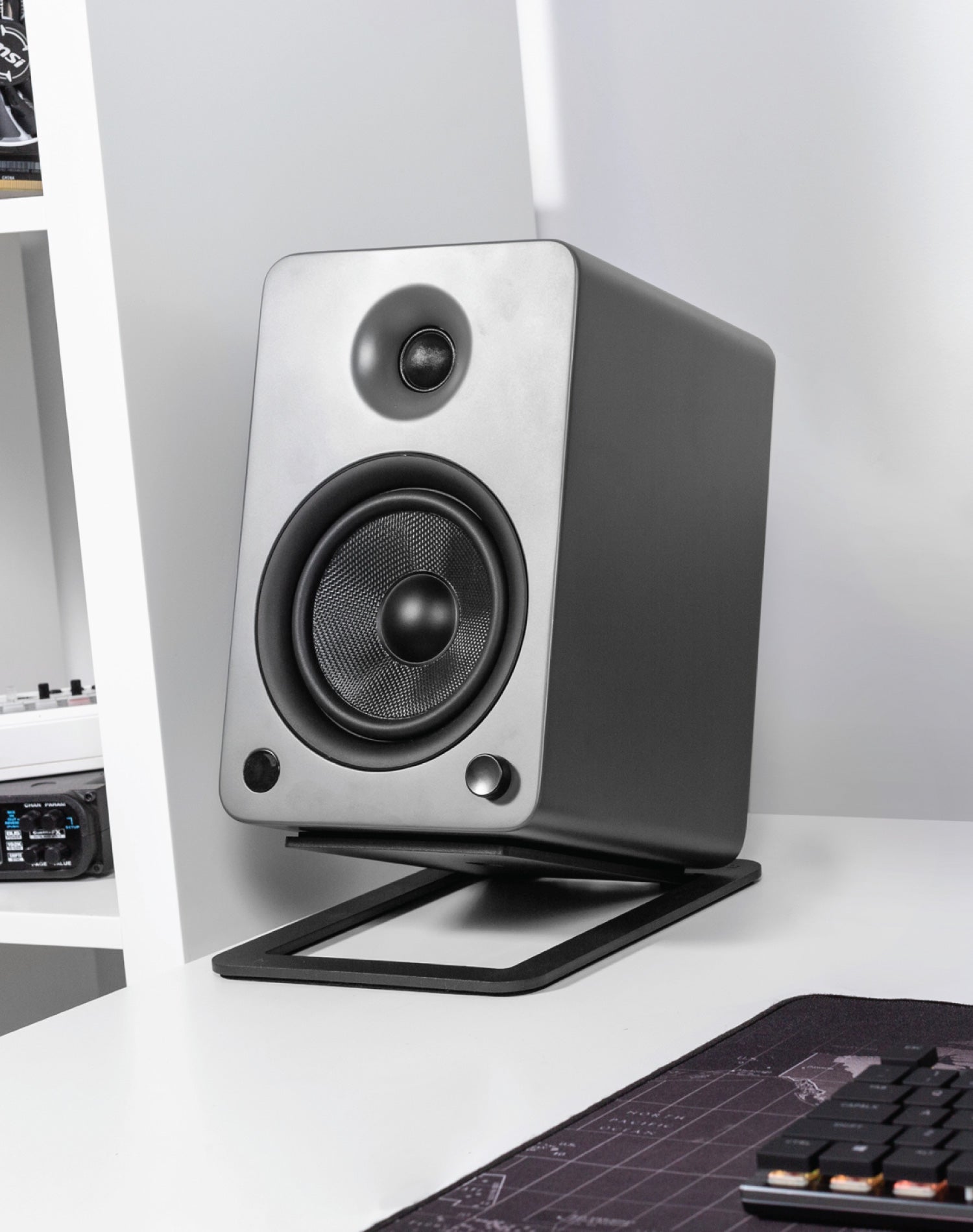 Foam padding on both top and bottom surfaces isolates speakers, diminishing unwanted resonance.