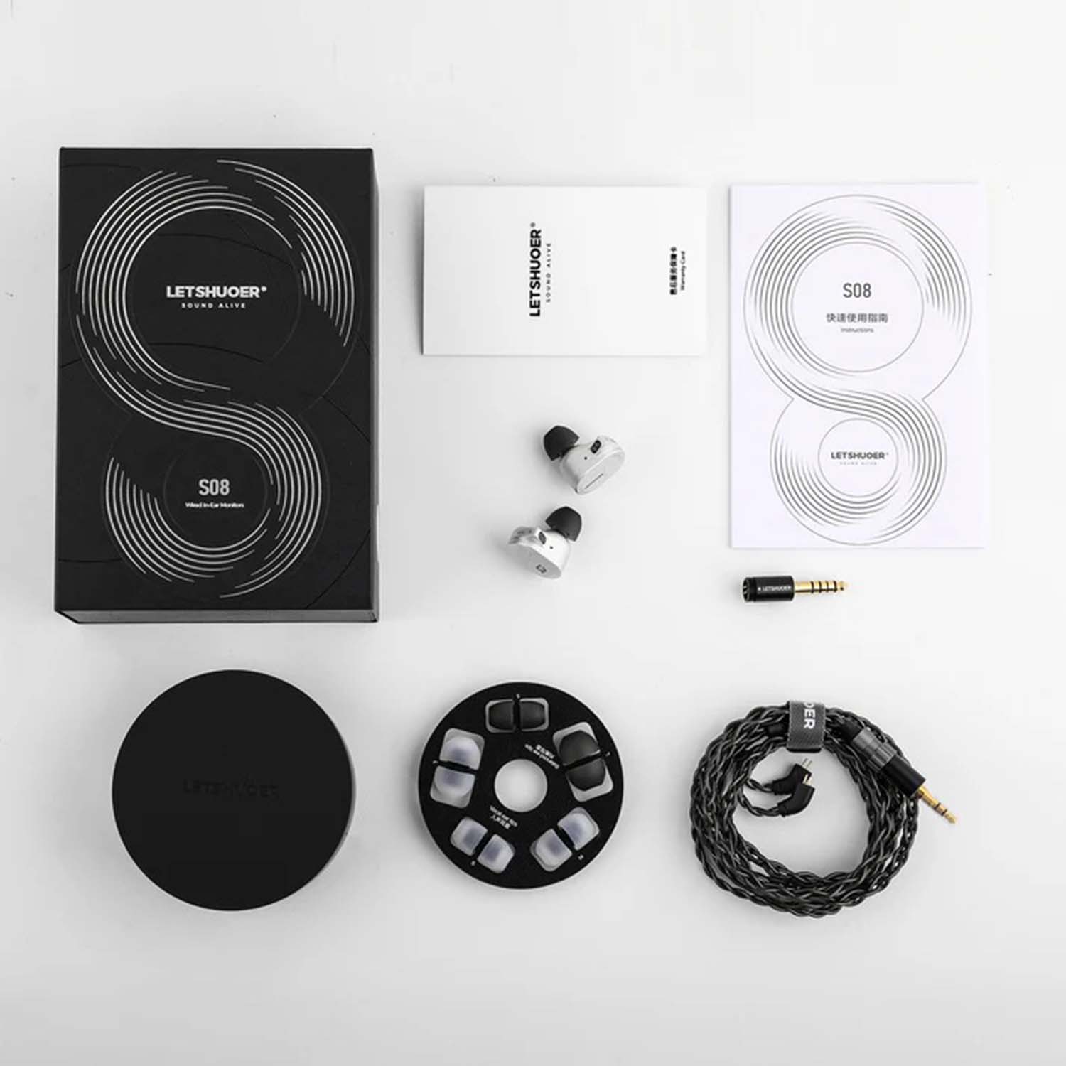 | Package Contents | Letshuoer S08 Detachable Cable Adapter plugs *2 Eartips User Manual Warranty Card |