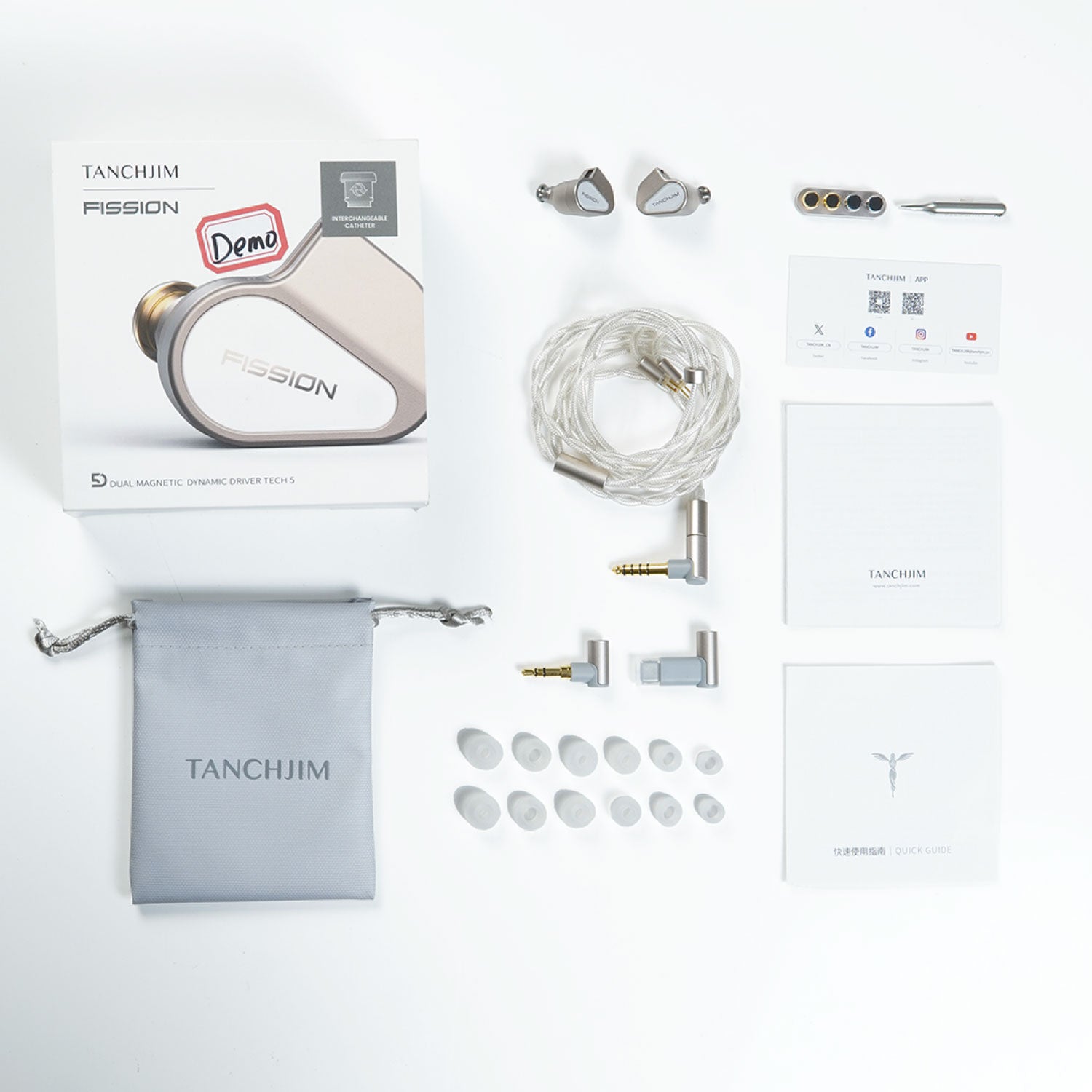 | Package Contents | Tanchjim Fission (Demo Unit) Replaceable Cable Filters Pouch Case 3.5/4.4/USB-C Replaceable Plugs Eartips Manual |